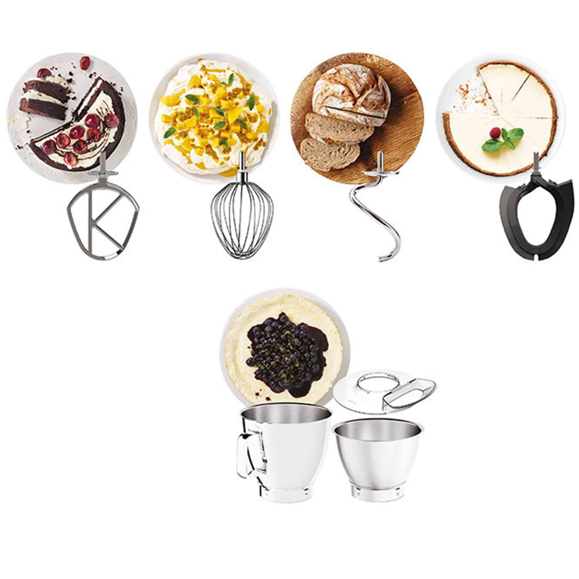Medfølgende tilbehør: 2 skåle (5 og 7 L), dejkrog, piskeris, K-pisker, cremepisker, stænkskærm (tåler opvaskemaskine)